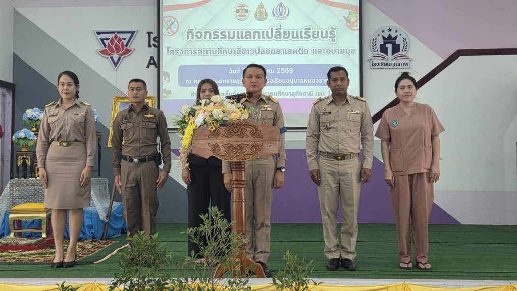 วันจันทร์ที่ 26 มกราคม พ.ศ. 2569 ที่หอประชุมสหราษฎร์สโมสร โรงเรียนอนุบาลหนองขาหย่าง อำเภอหนองขาอย่าง จังหวัดอุทัยธานี นายนฤเบศวร์ จีระพงษ์เอกธนา นายอำเภอหนองขาหย่าง เป็นประธานในพิธีเปิด “กิจกรรมการแลกเปลี่ยนเรียนรู้การดำเนินงาน โครงการสถานศึกษาสีขาวปลอดยาเสพติดและอบายมุข ประจำปีการศึกษา 2568” เพื่อขับเคลื่อนการสร้างภูมิคุ้มกันและป้องกันปัญหายาเสพติดในสถานศึกษาอย่างยั่งยืน