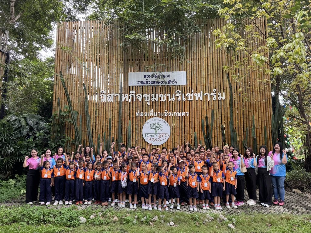 จากนั้นเดินทางไปยังวิสาหกิจชุมชนริเช่ฟาร์ม (Riche Farm) นักเรียนได้นั่งรถรางชมฟาร์มและเข้าร่วมฐานกิจกรรมทั้ง 4 ฐาน ได้แก่ การปรุงดินปลูกผัก การเลี้ยงไก่ไข่อารมณ์ดี การเรียนรู้สมาร์ทฟาร์ม และการเพาะกล้าข้าวนาโยน ![]()
