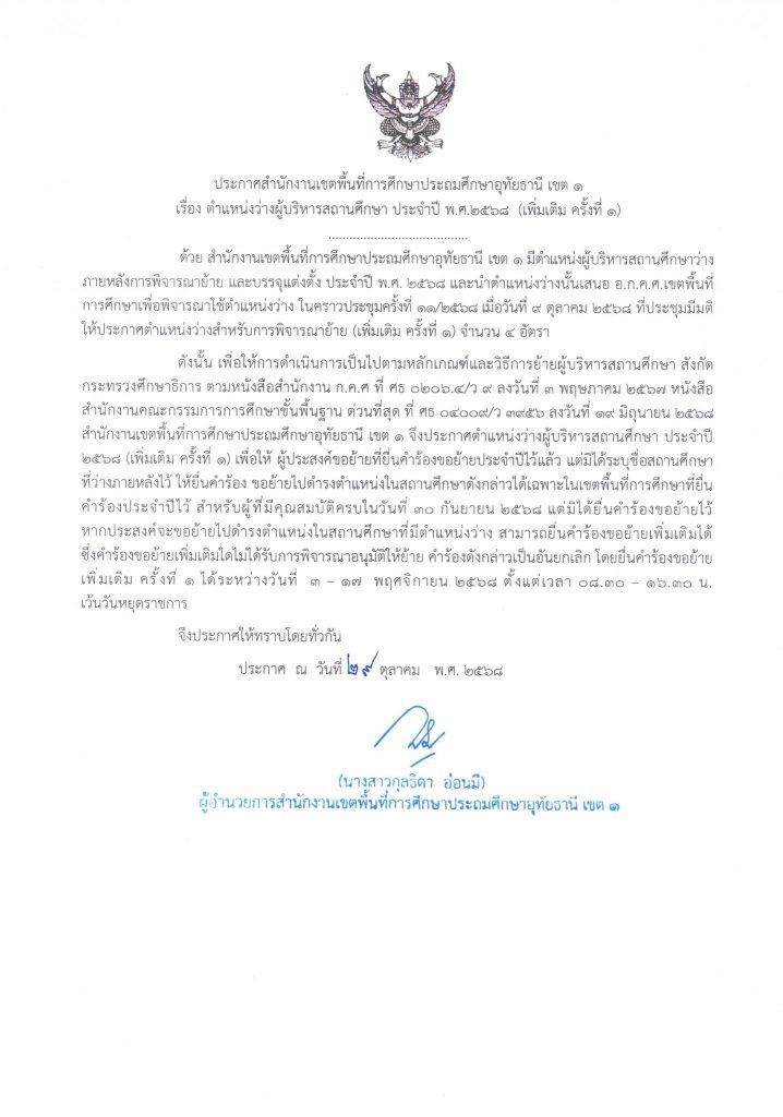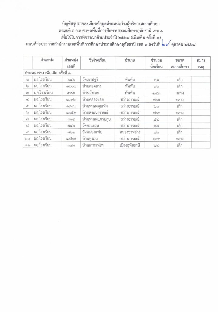 ตำแหน่งว่างผู้บริหารสถานศึกษา ประจำปี พ.ศ. ๒๕๖๘ (เพิ่มเติมครั้งที่ ๑ ) การบริหารงานบุคคล 31 ตุลาคม 202531 ตุลาคม 2025 ประกาศสำนักงานเขตพื้นที่การศึกษาประถมศึกษาอุทัยธานี เขต ๑ เรื่อง ตำแหน่งว่างผู้บริหารสถานศึกษา ประจำปี พ.ศ. ๒๕๖๘ (เพิ่มเติมครั้งที่ ๑ ) สังกัดสำนักงานเขตพื้นที่การศึกษาประถมศึกษาอุทัยธานี เขต ๑ Share Facebook Twitter Pinterest Linkedin